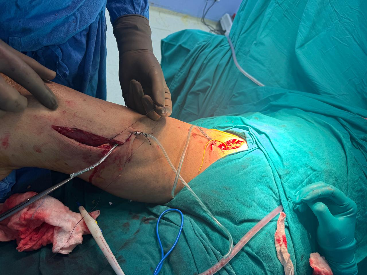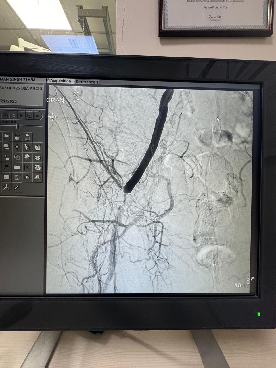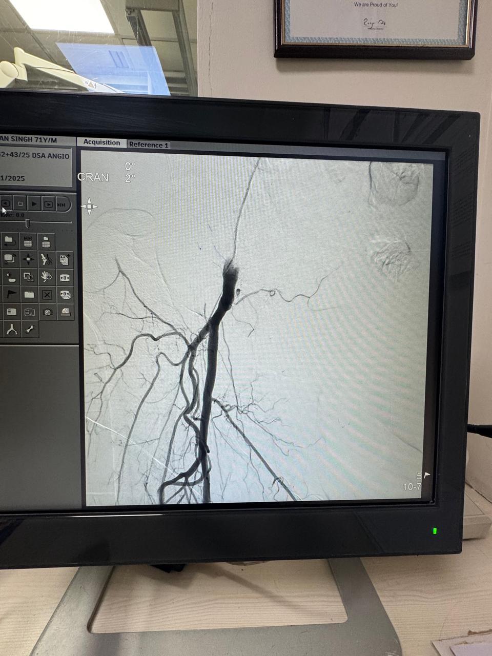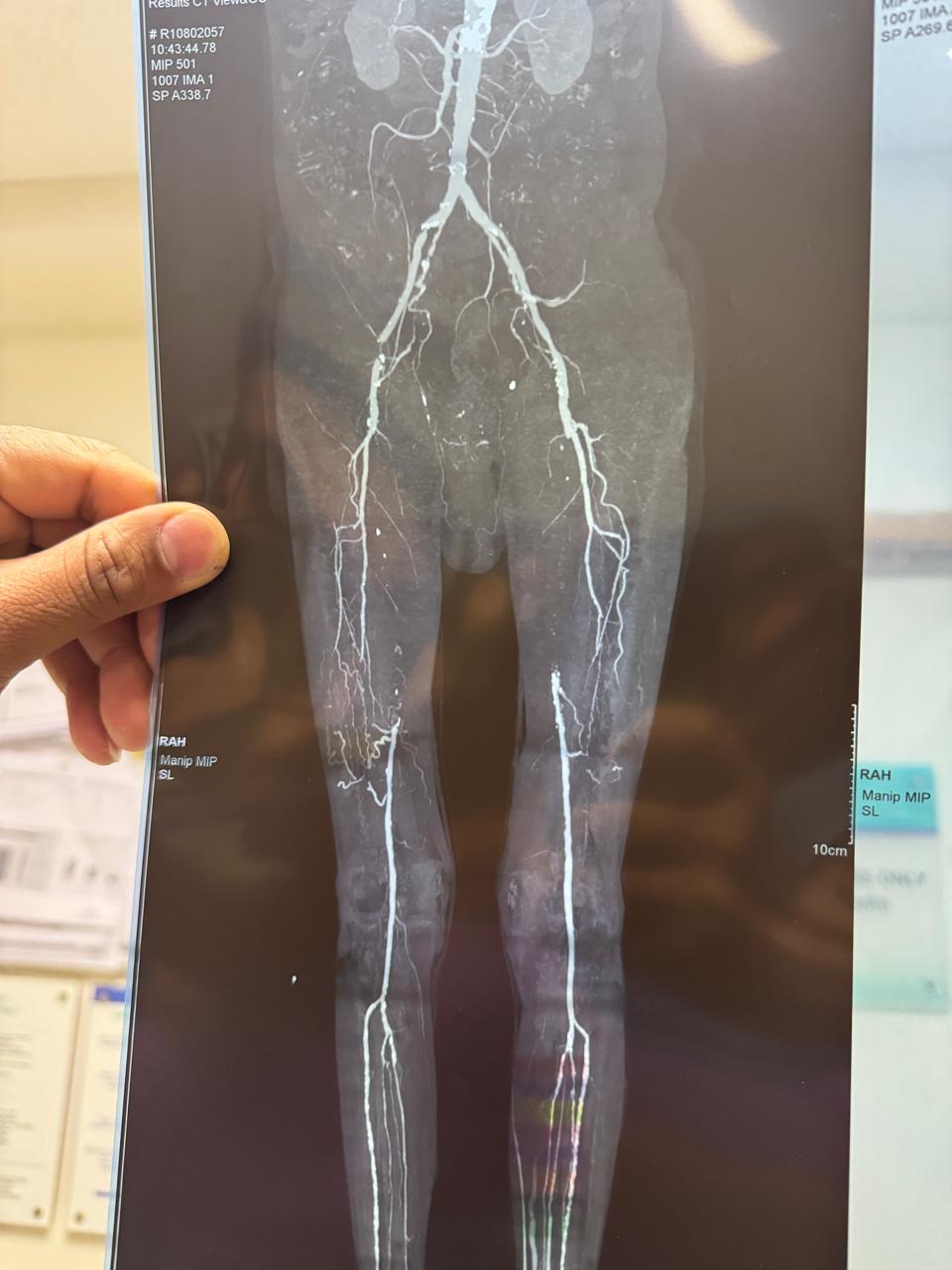 Right leg critical ischemia grade 5 Hybrid treatment ( right iliac steering + angioplasty then femoro_popliteal bypass) done. Post -op ATA & PTA palpable confirmed on hand Doppler. Patient all symptoms subsides and walk normally.
